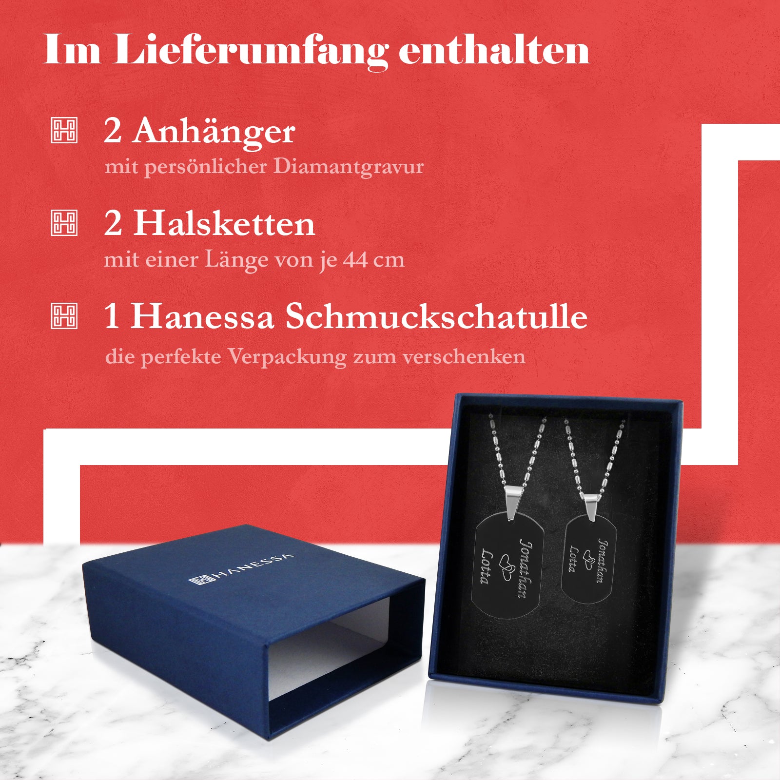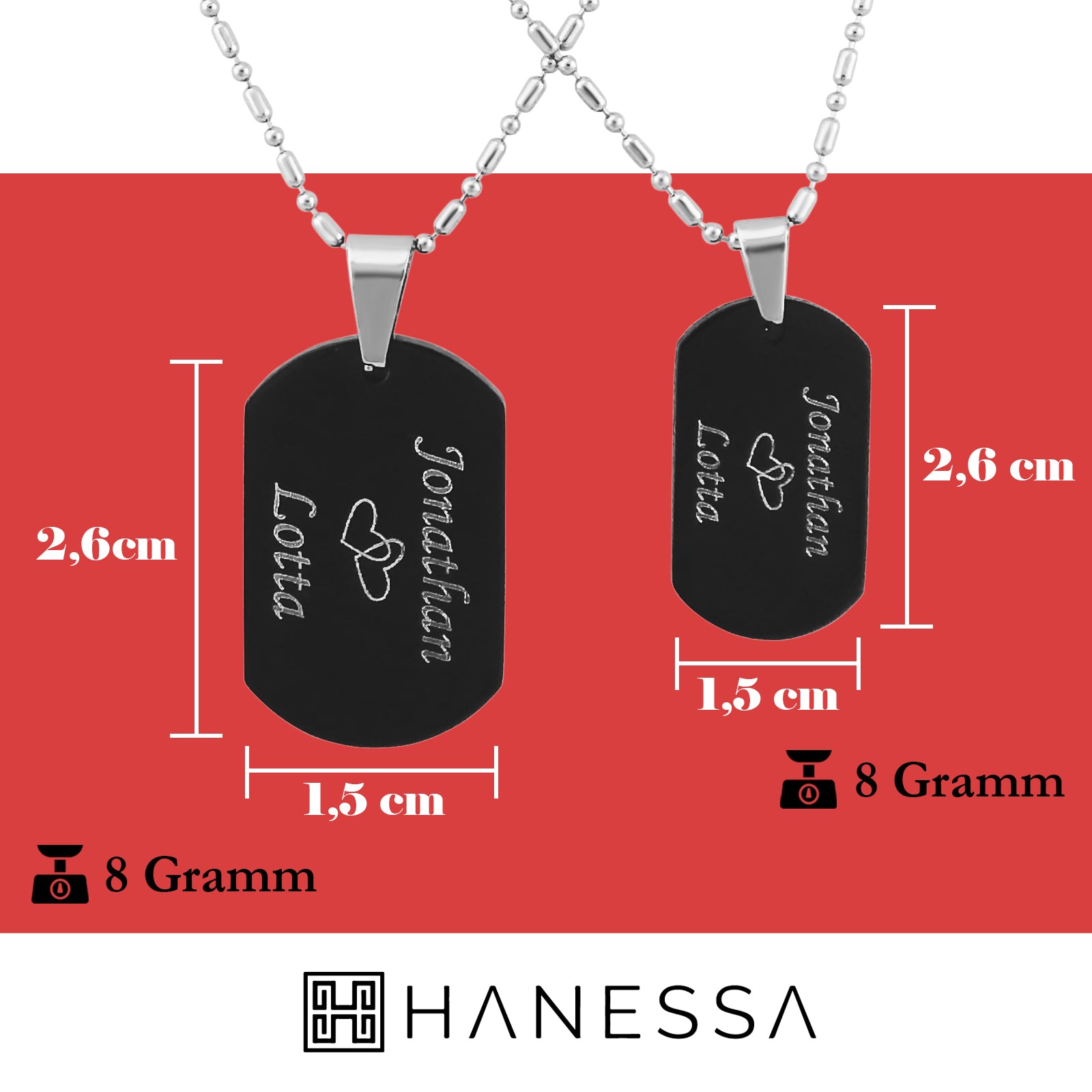 Mit Ihrer neuen Halskette von Hanessa halten Sie in kürze ein hochwertiges Schmuckstück mit persönlichen Gravur in den Händen. Durch unsere Liebe zum Detail erhalten Sie ein einmaliges Unikat, welches mit Ihrer Wunschgravur angefertigt wird.Durch die individuelle Gravur können Sie nicht nur Ihrer Freundin, Ehefrau, Mutter, Tochter oder BFF sondern auch Ihrem Freund, Ehemann, Vater oder Sohn ein persönliches Geschenk der Freundschaft und Liebe machen. Schmuck von HANESSA ist hautverträglich und ein tolles Geschenk zu jedem Anlass: Geburtstag, Jahrestag, Verlobung, Hochzeit, Weihnachten, Nikolaus oder in anderen Situationen wie Vatertag, Muttertag oder Valentinstag. Zwei Partnerketten mit Anhängern im ausgefallenen Design dank individueller Wunschgravur eine tolle und persönliche Geschenkidee. Der Lieferumfang enthält: 2 Gravierte Anhänger, 2 Ketten, 2 Schmuckbeutel Größe des Anhängers: 15x26mm , Länge der Kette: 44cm, Gesamtgewicht: 8 Gramm