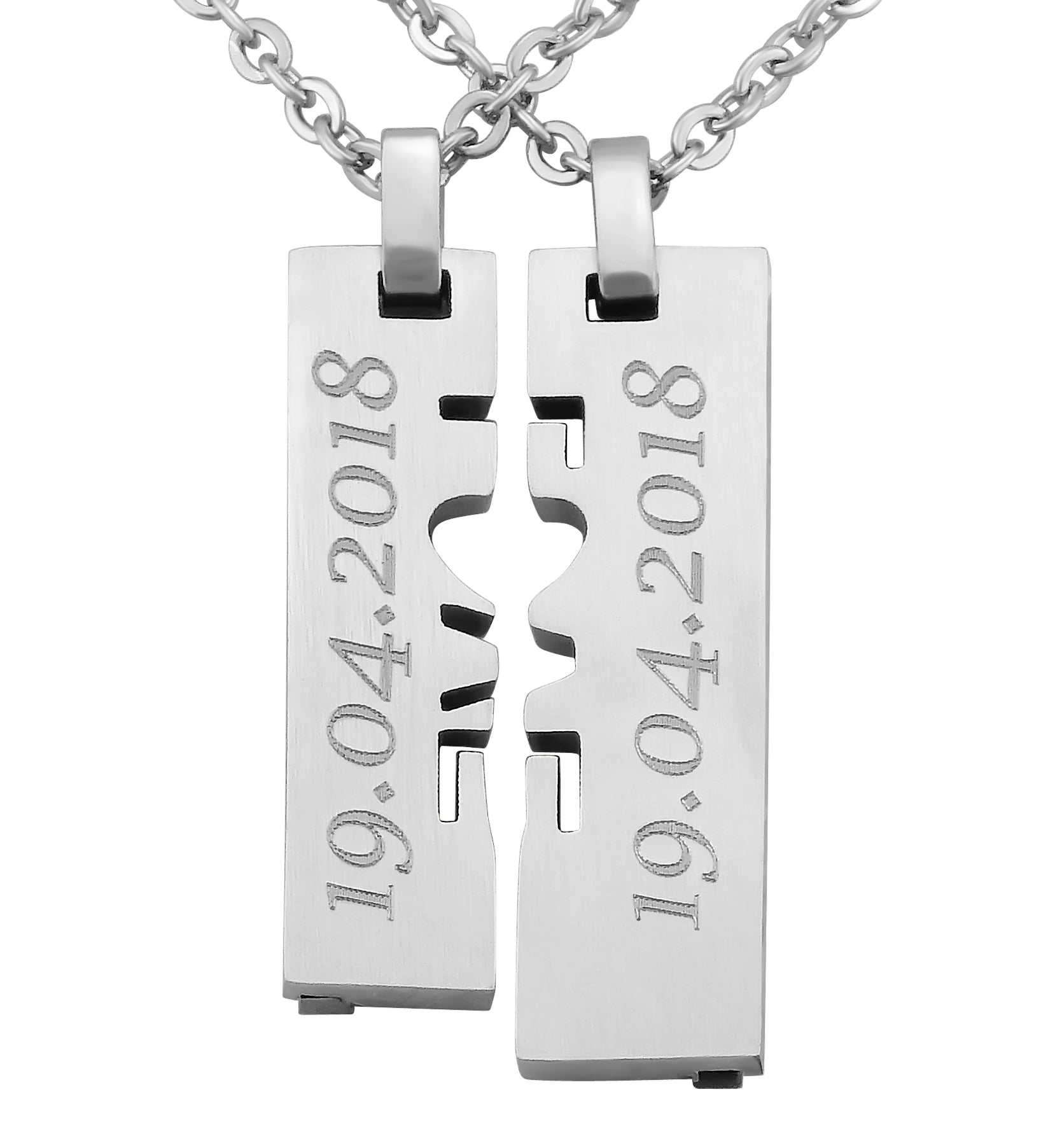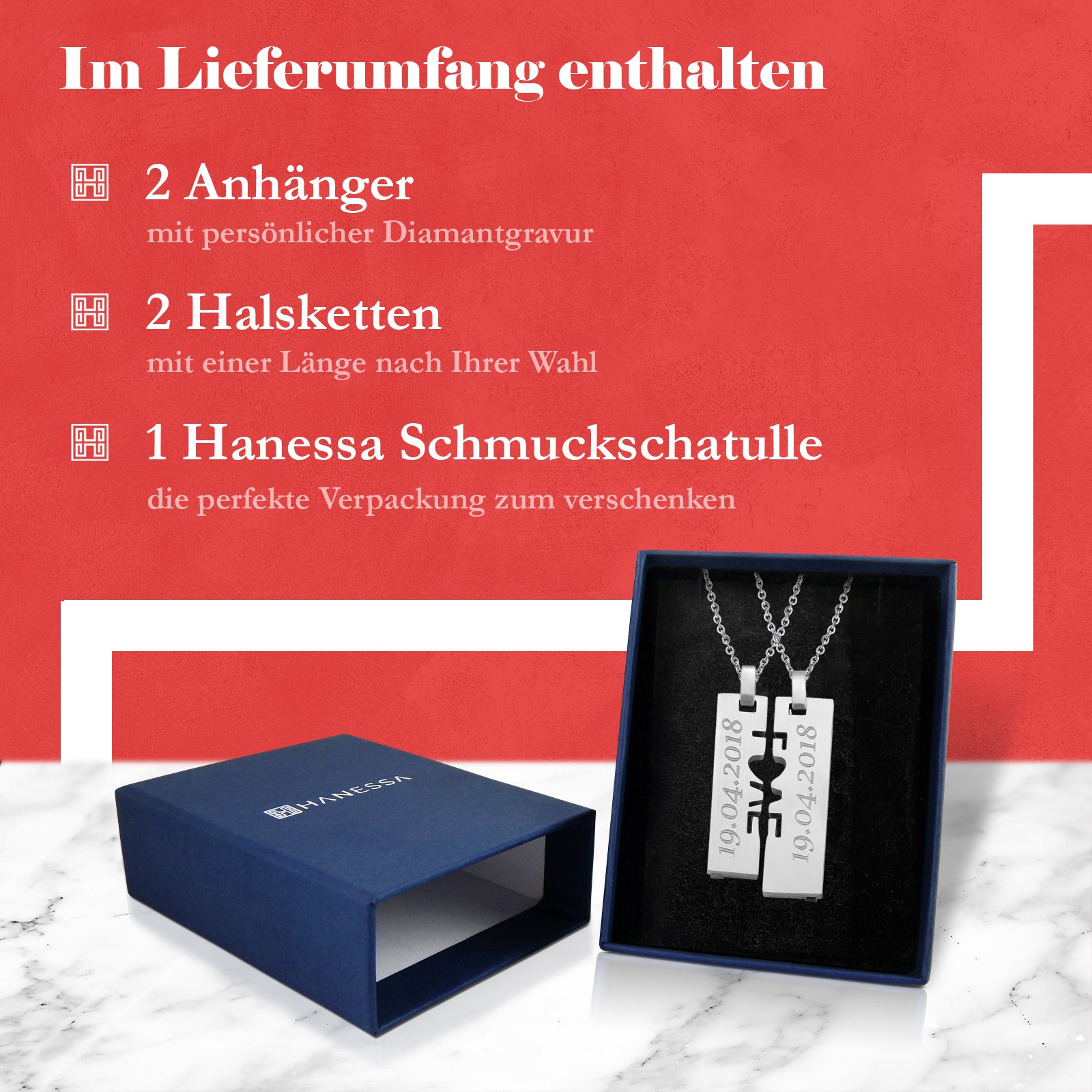 Zwei Partnerketten mit Anhängern im ausgefallenen Design dank individueller Wunschgravur eine tolle und persönliche Geschenkidee. Der Lieferumfang enthält: 2 Gravierte Anhänger, 2 Ketten, 2 Schmuckbeutel