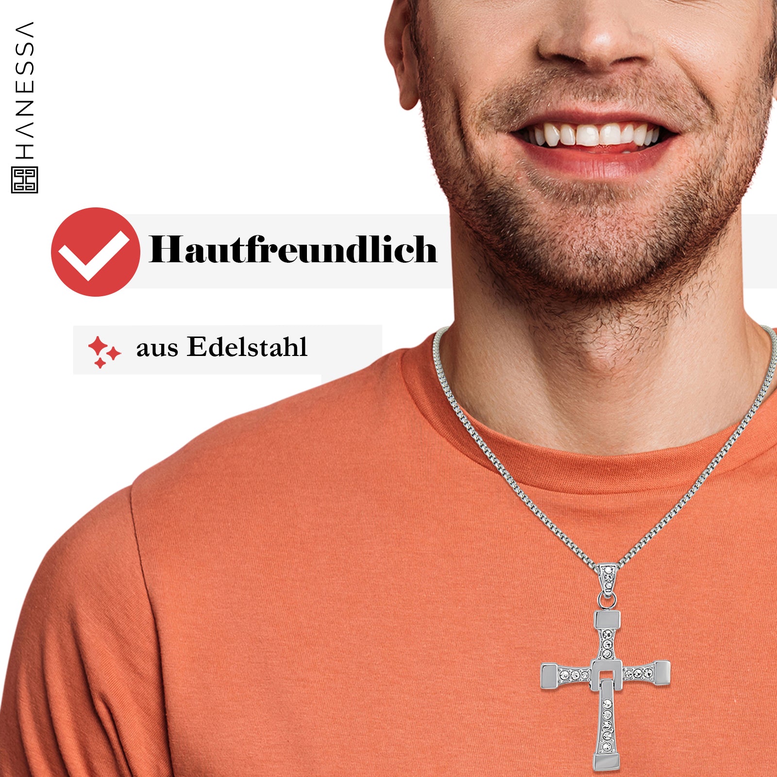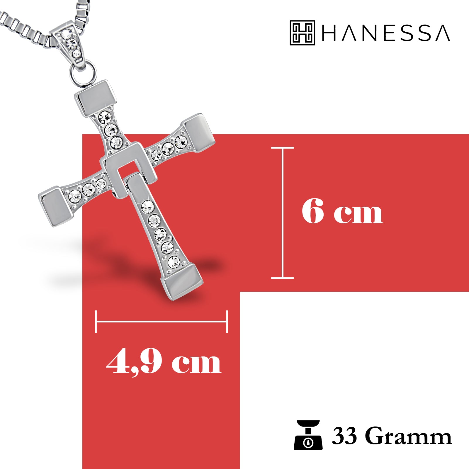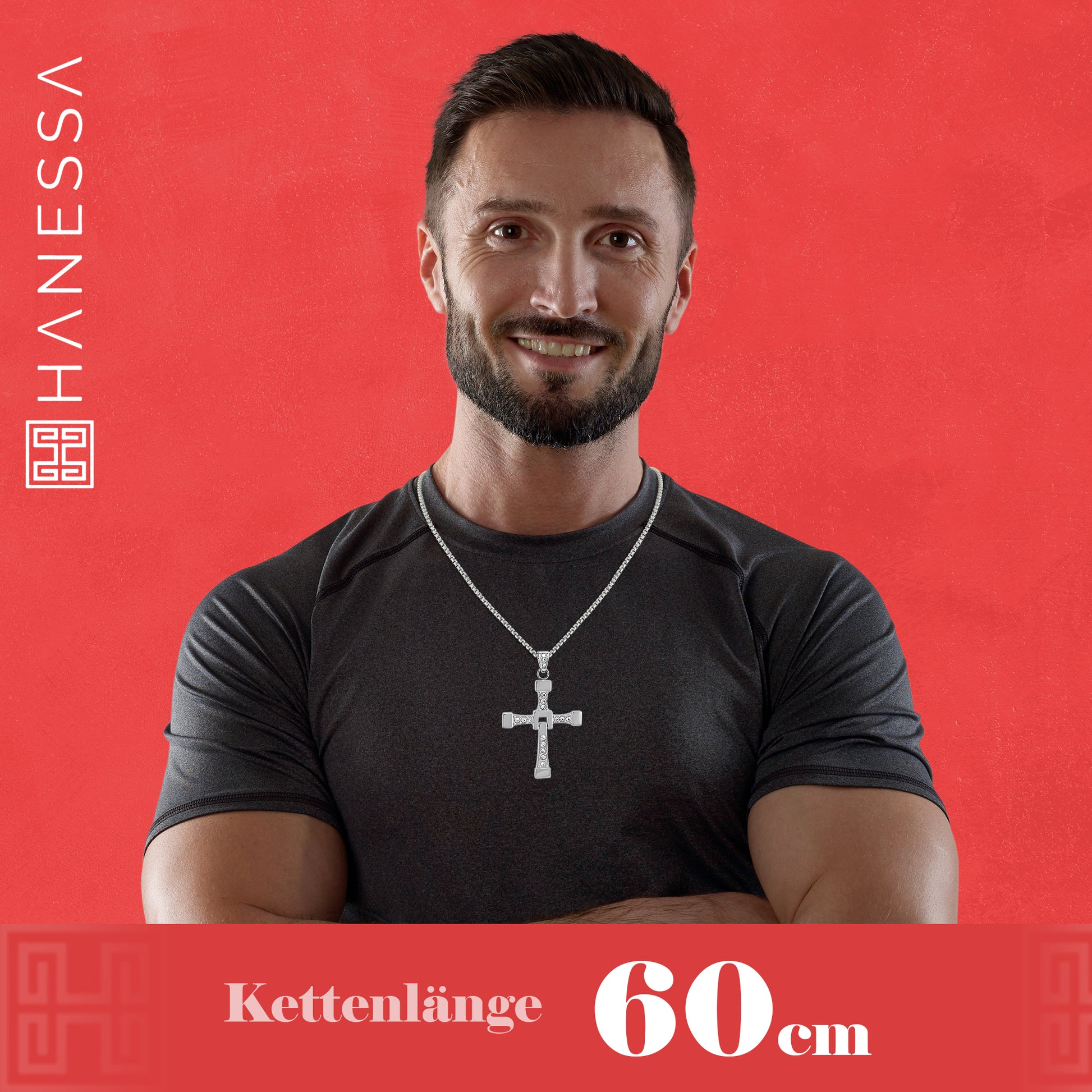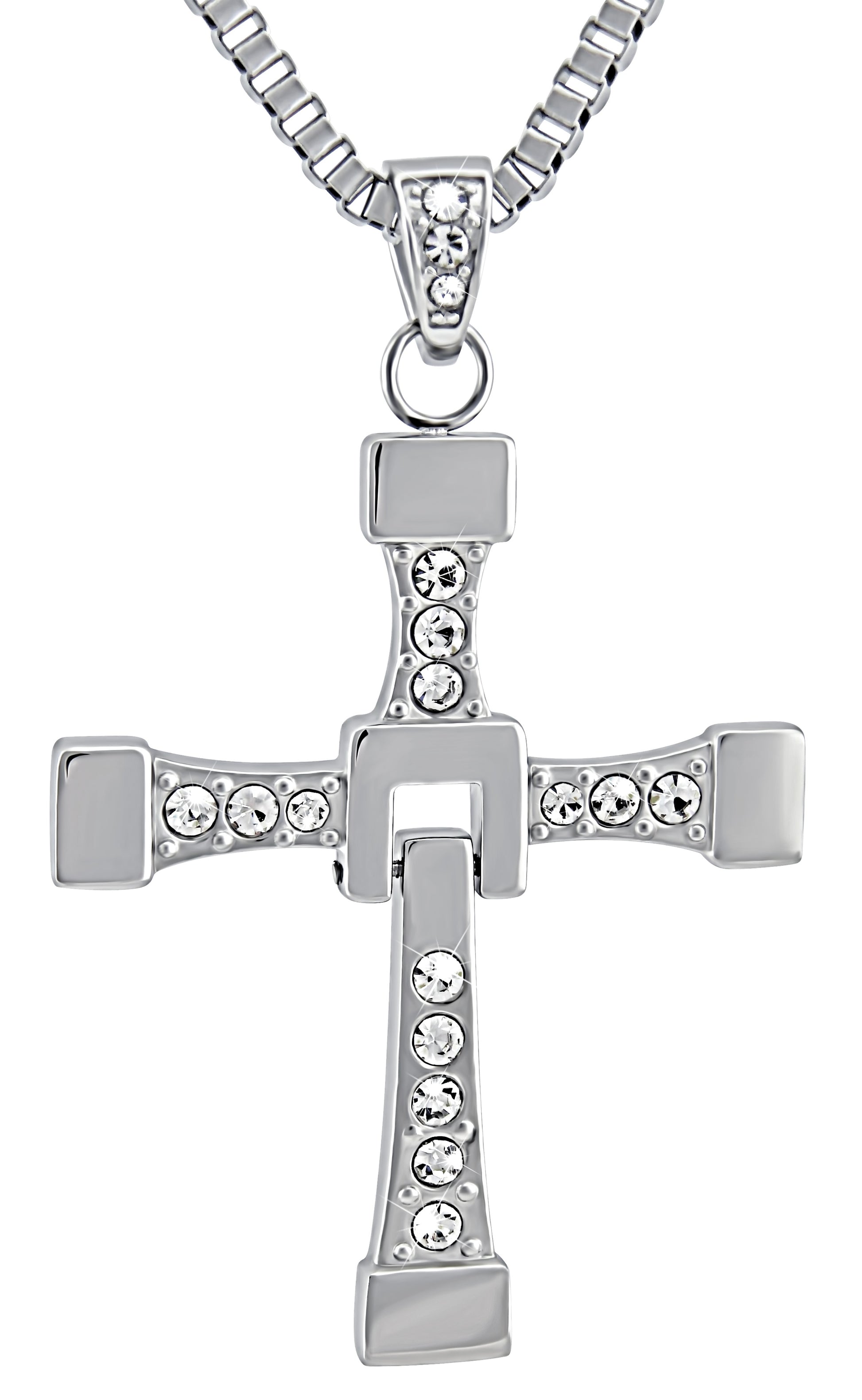 Personalisierte Vin Diesel Kette Edelstahl mit Kreuz-Anhänger und Strass Steinen 60cm lang - Dominic Toretto Halskette inspiriert von Fast and Furious
