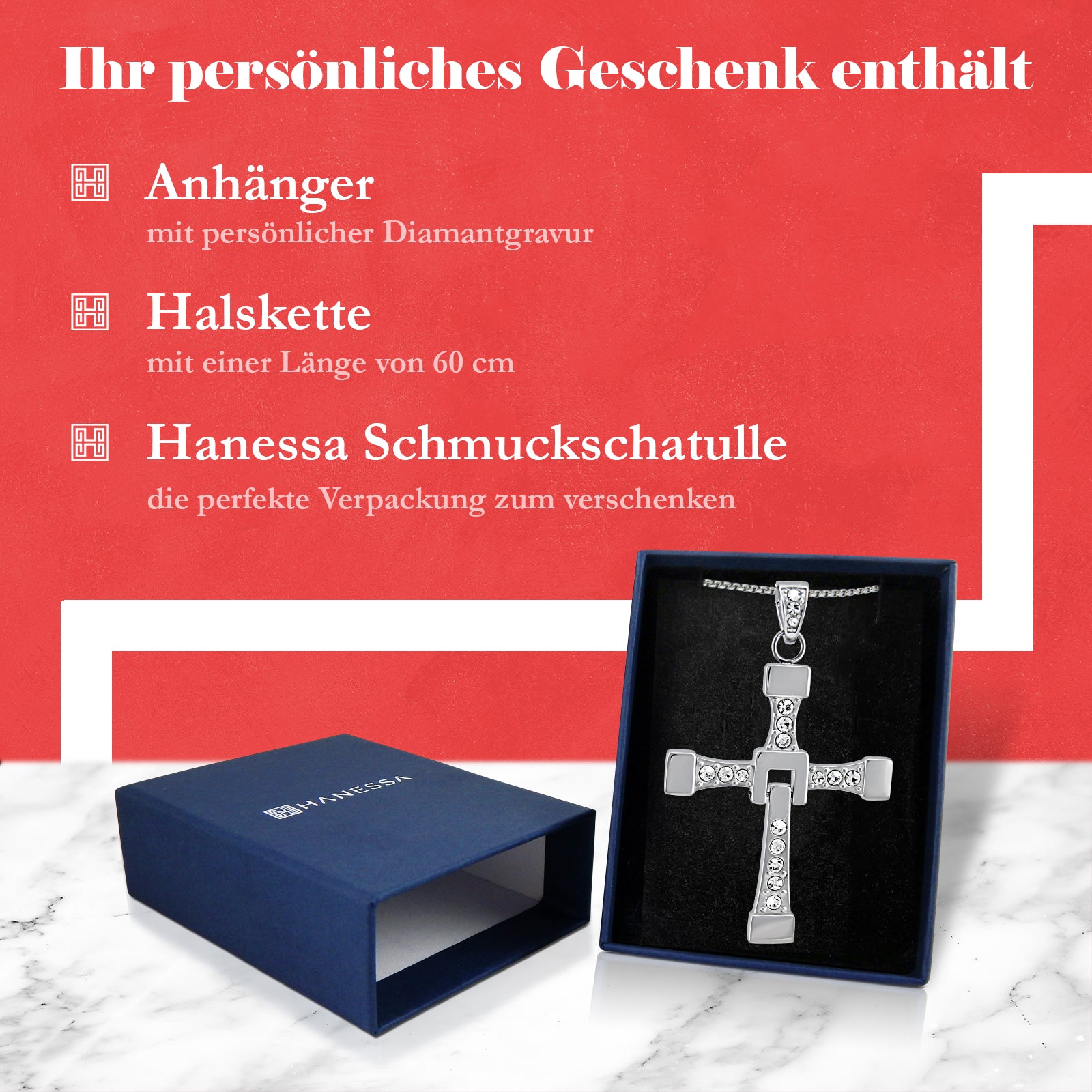 Mit Ihrer neuen Halskette von Hanessa halten Sie in kürze ein hochwertiges Schmuckstück mit persönlichen Gravur in den Händen. Durch unsere Liebe zum Detail erhalten Sie ein einmaliges Unikat, welches mit Ihrer Wunschgravur angefertigt wird.