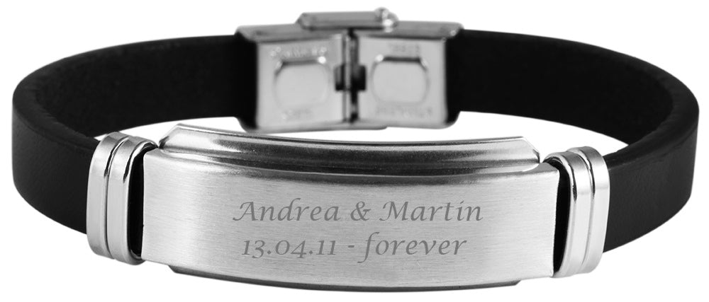 Personalisiertes Armband mit Gravur für Männer und Frauen Edelstahl Leder schwarz silber Länge 21 cm