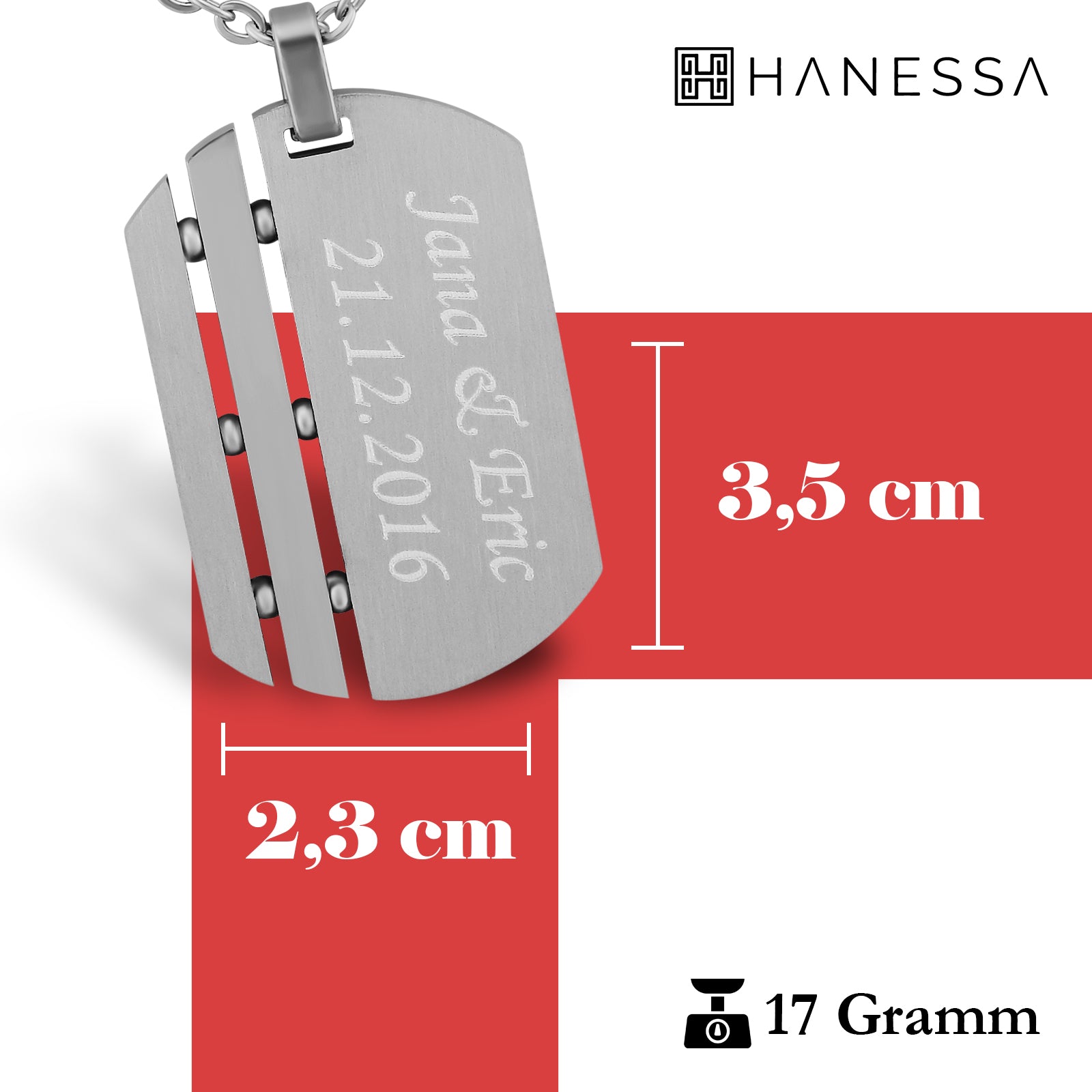 Mit Ihrer neuen Halskette von Hanessa halten Sie in kürze ein hochwertiges Schmuckstück mit persönlichen Gravur in den Händen. Durch unsere Liebe zum Detail erhalten Sie ein einmaliges Unikat, welches mit Ihrer Wunschgravur angefertigt wird.
