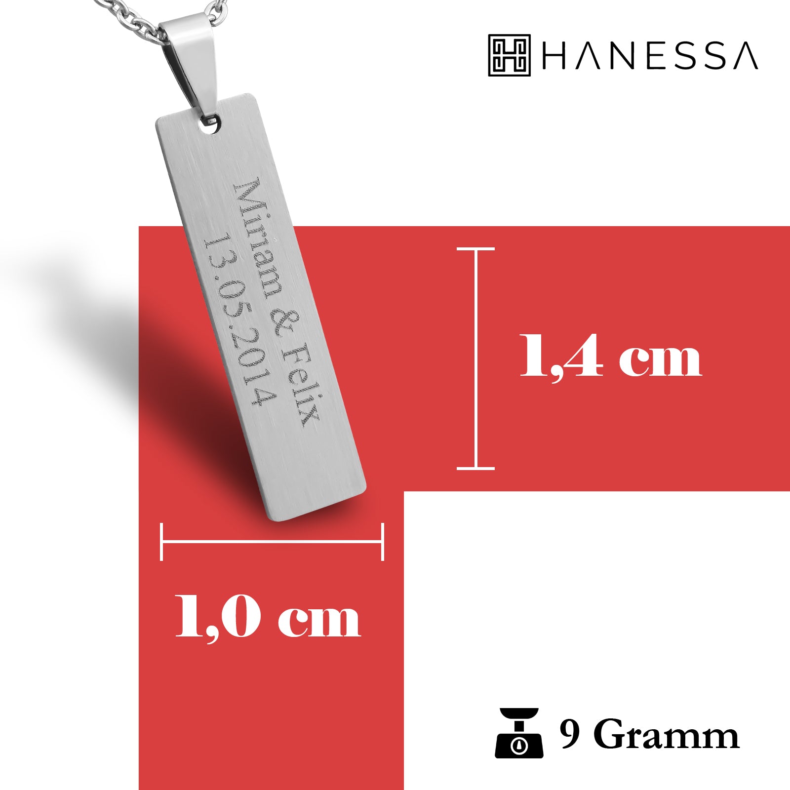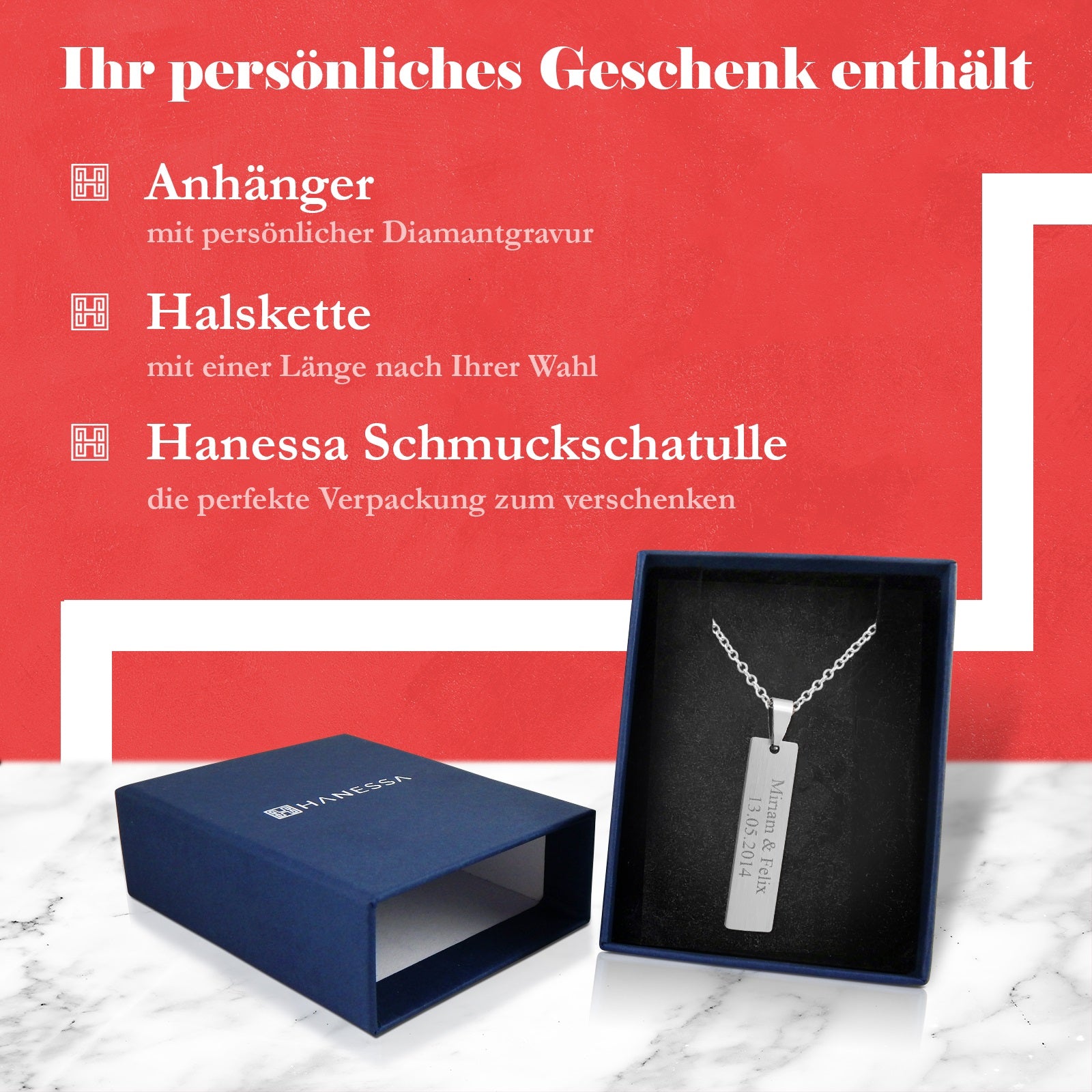 Mit Ihrer neuen Halskette von Hanessa halten Sie in kürze ein hochwertiges Schmuckstück mit persönlichen Gravur in den Händen. Durch unsere Liebe zum Detail erhalten Sie ein einmaliges Unikat, welches mit Ihrer Wunschgravur angefertigt wird.
